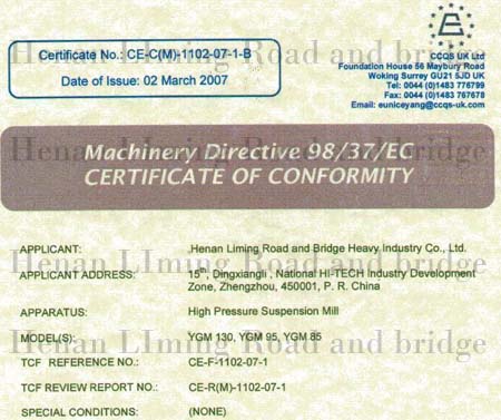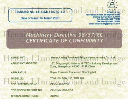 熱烈祝賀我公司超壓梯形磨粉機、高壓懸輥磨粉機全套生產線系列產品通過歐盟CE認證。我公司也是目前國內一家通過同類設備CE認證的企業(yè)。