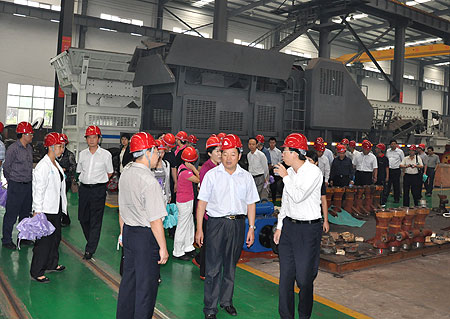 喬經(jīng)理首先代表集團(tuán)公司對中青班各位領(lǐng)導(dǎo)的光臨表示了熱烈的歡迎,對公司發(fā)展、工業(yè)園運營、產(chǎn)品生產(chǎn)等進(jìn)行了具體詳細(xì)的講解。在稍后的工業(yè)園巡查過程中,向考察組一行系統(tǒng)介紹了公司在礦石破碎和人工制砂成套工藝的技術(shù)優(yōu)勢,以及公司在超細(xì)粉加工、電廠脫硫石灰石磨粉、超壓梯形磨粉機(jī)等節(jié)能環(huán)保設(shè)備研發(fā)領(lǐng)域的節(jié)能降耗、市場開發(fā)等情況,現(xiàn)場詳細(xì)解答了考察組提出的各種問題。